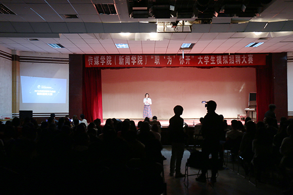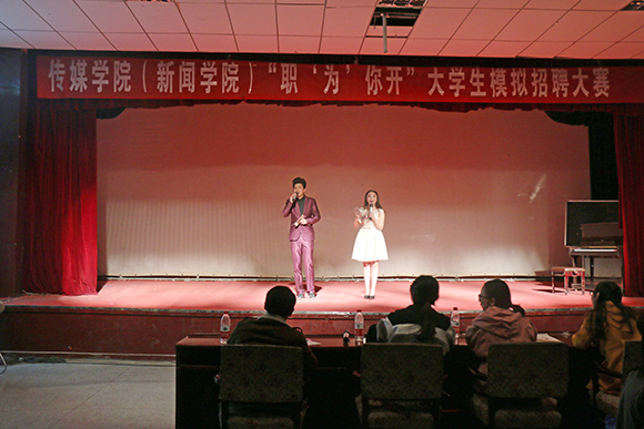 本次模拟招聘大赛分“职场亮剑”、“‘职’说方圆”、“‘职’面未来”、“奋起‘职’追”四个环节,参赛选手模拟“电视台编导、播音员、记者、主持人、动画设计、新闻编辑”六个职位的竞聘。