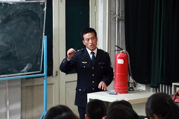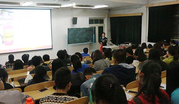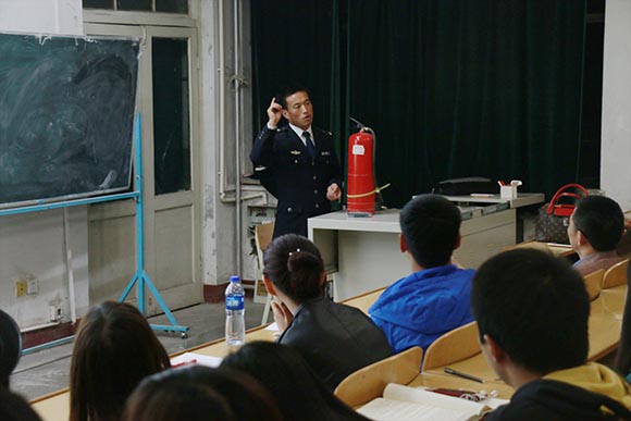 任教官首先以一组数据分析近年火灾发生的严峻形势,并总结其四个主要原因:一是安全意识淡薄,二是用火用电不慎,三是缺乏逃生技能,四是缺乏必备应急消防设备。任教官以大量翔实的案例讲解电器类火灾,强调其隐蔽性、突发性及迅速成灾性,并强调其预防要点:严禁私拉乱接私控电网、大功率用电器专线专用、人走断电。接着,任教官又讲解了公交起火逃生技巧、火场逃生技巧等。