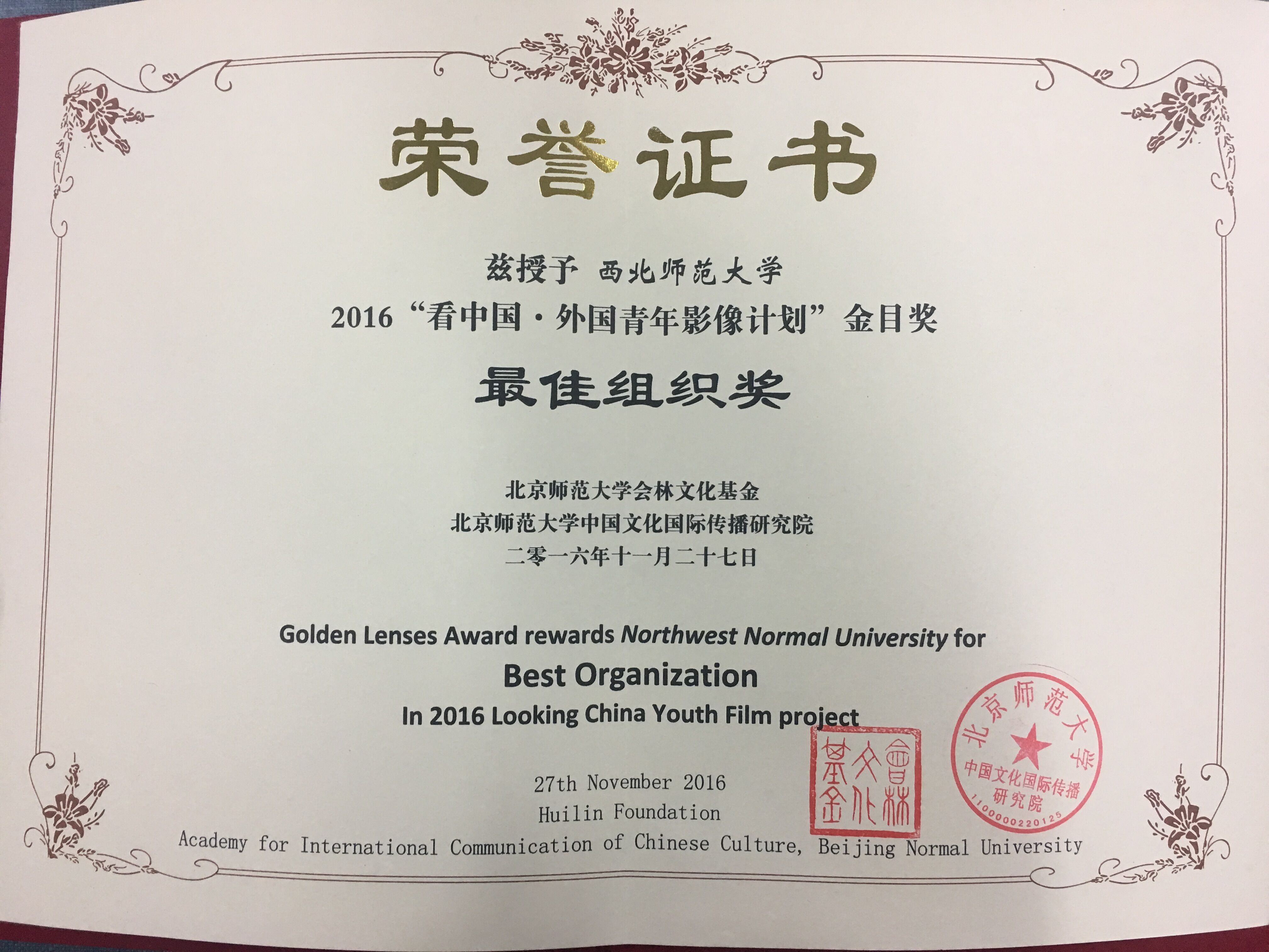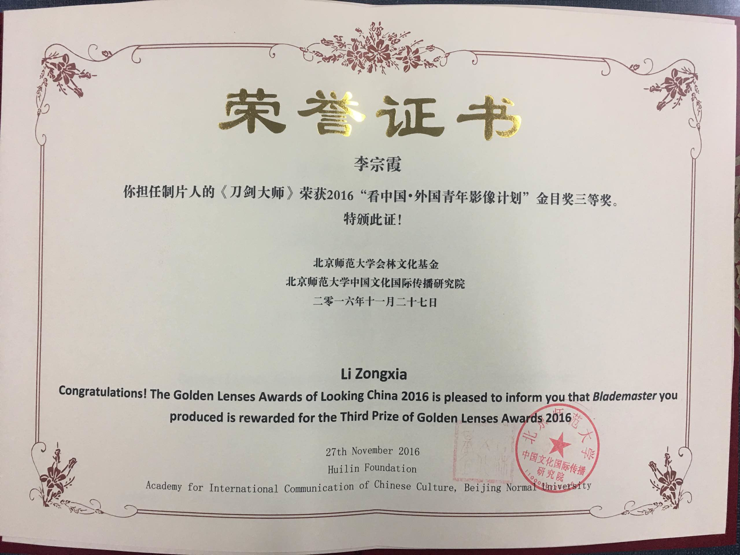 11月27日下午,2016年度“看中国•金目奖”颁奖典礼在北京师范大学京师学堂举行。南非青年Tristan和传媒学子李宗霞合作拍摄的纪录片《刀剑大师》(The Sword Master)获得“看中国•金目奖”三等奖。gg999策略手机白菜获“最佳组织奖”。公司党委副书记、副经理王德祥及任志明教授参加颁奖典礼。同时,他们还参加了首届“看中国”中国文化多样性--外国青年对中国文化形象的认知、建构与传播论坛并发言。