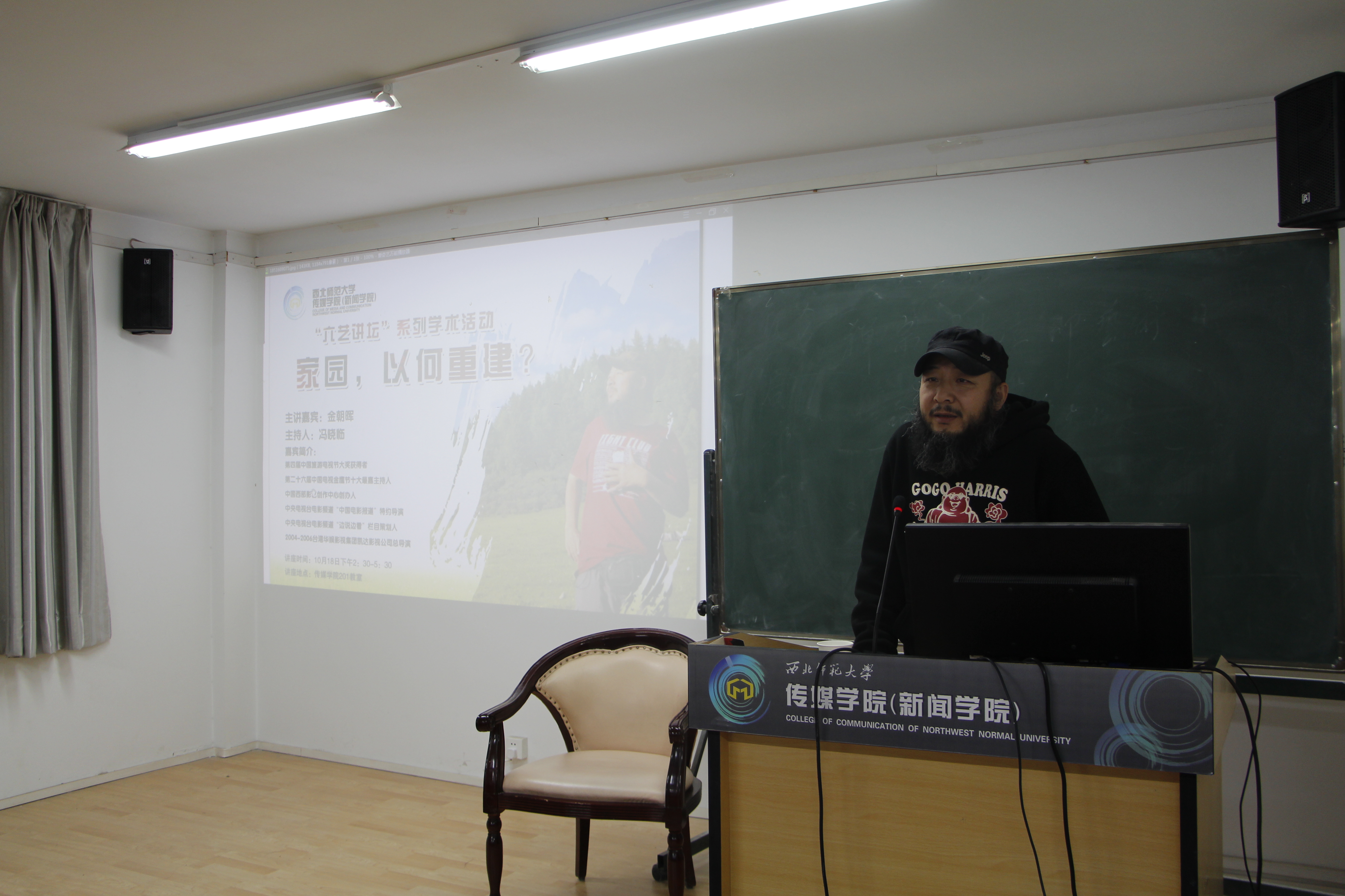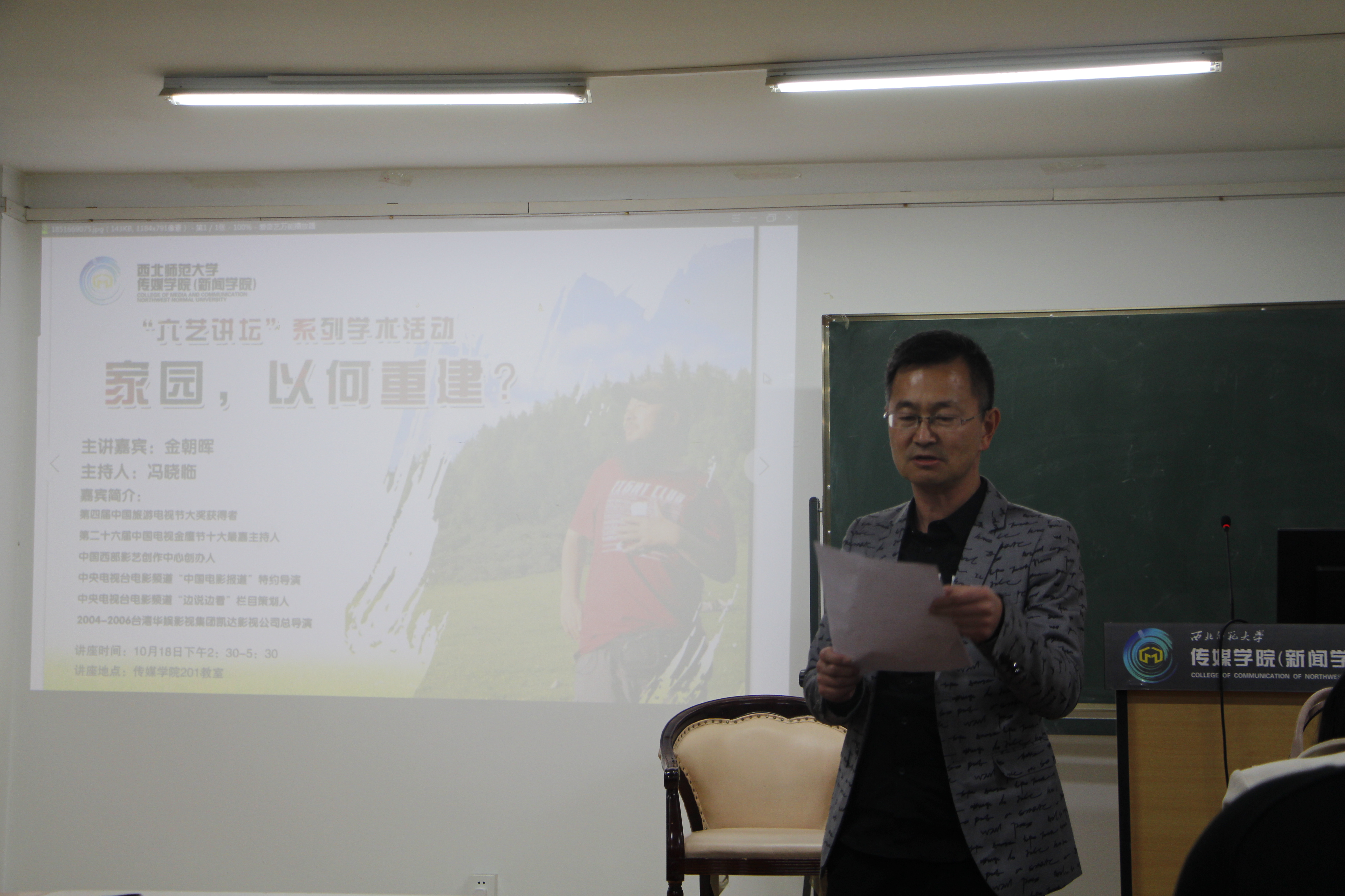 10月18日下午两点半,第四届中国旅游电视节大奖获得者、第26届中国电视金鹰节最佳主持人、中国西部影艺创作中心创办人、中央电视台电影频道“中国电影报道”特约导演金朝晖,在gg999策略手机白菜201教室,以“家园,以何重建”为主题进行了学术演讲。讲座由gg999策略手机白菜教授冯晓临主持,gg999策略手机白菜部分师生听取了此次讲座。此次活动是公司“六艺讲坛”系列活动之一。