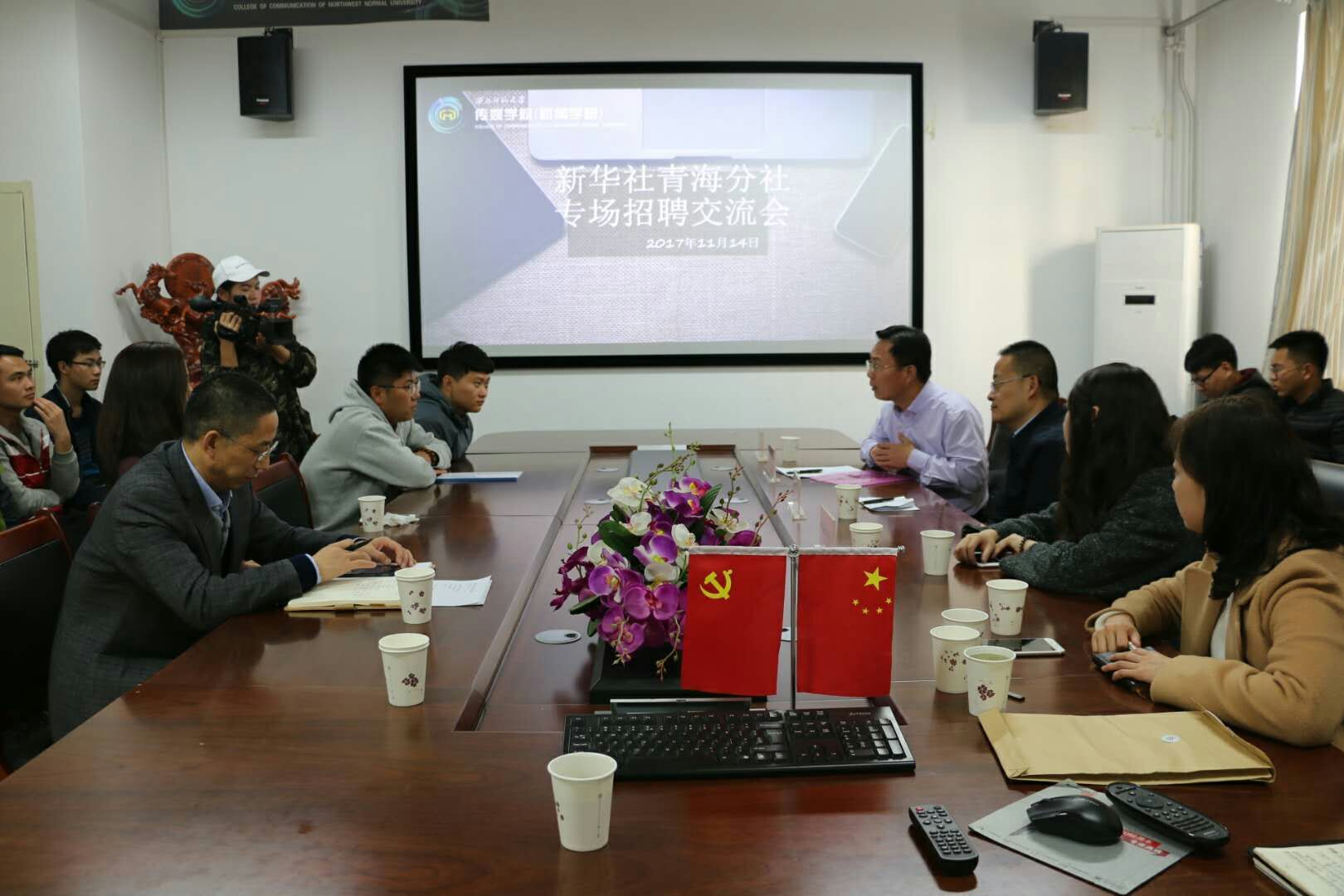 11月14日下午,gg999策略手机白菜于公司310会议室举办了新华社青海分社专场招聘交流活动。新华社青海分社副社长毛磊,办公室主任候德强及王金金、候晋参加。参加本次交流会的有公司党委副书记、副经理王德祥,新闻系副主任庄金玉,公司新闻系应届本科毕业生与研究生以及计算机科学与工程公司的应届毕业生。