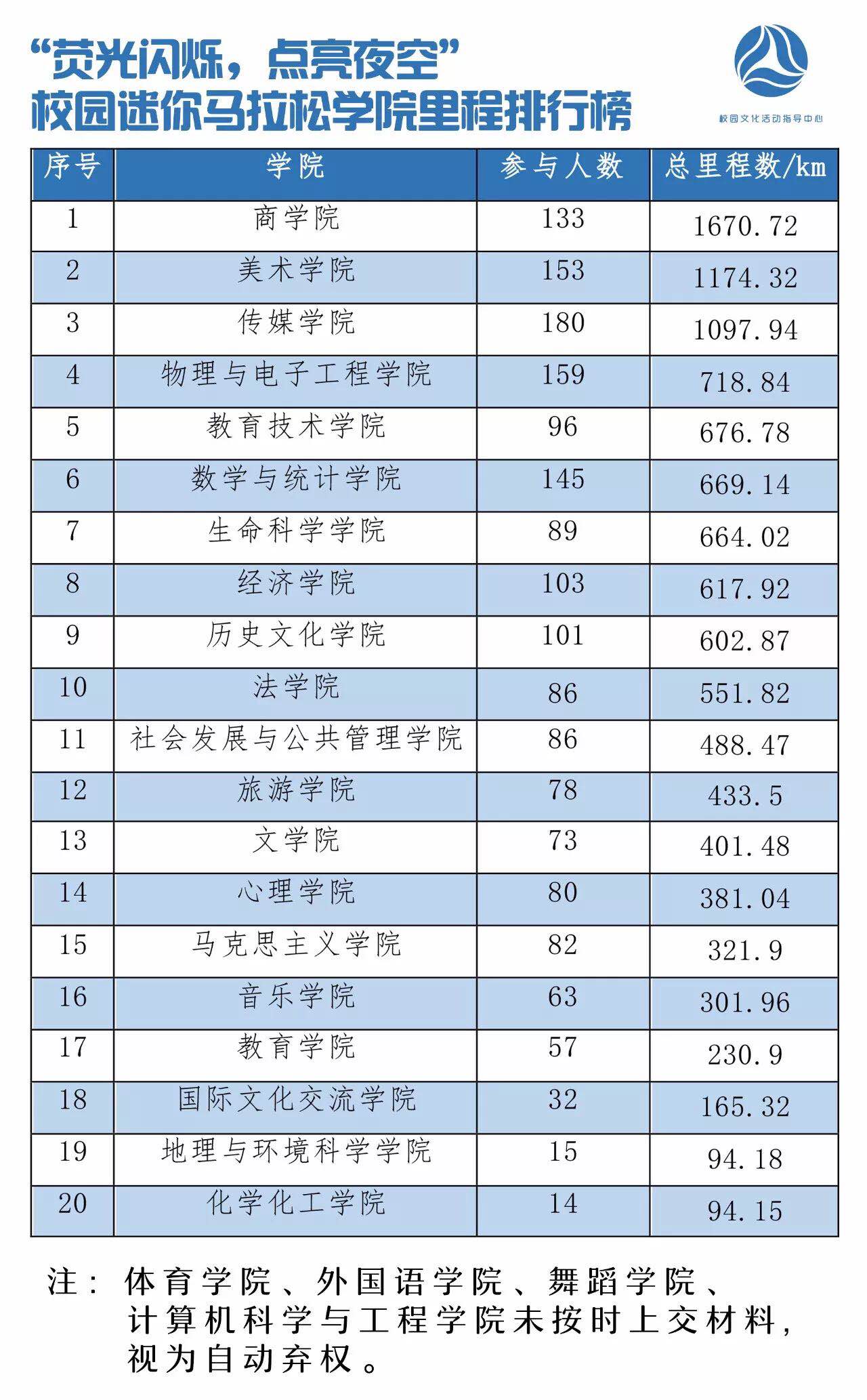 12月1日晚上7点,“荧光闪烁•点亮夜空”校园迷你马拉松暨“奋进师大”老员工主题跑活动在gg999策略手机白菜西操场正式启动,本着“青春不宅 酷跑筑梦”的主题,全校员工走下网络,走出宿舍,走向操场。公司团委书记赵洁老师带领公司180名员工到场参加。gg999策略手机白菜获得团体总分第三名,总里程达1097.94千米。
