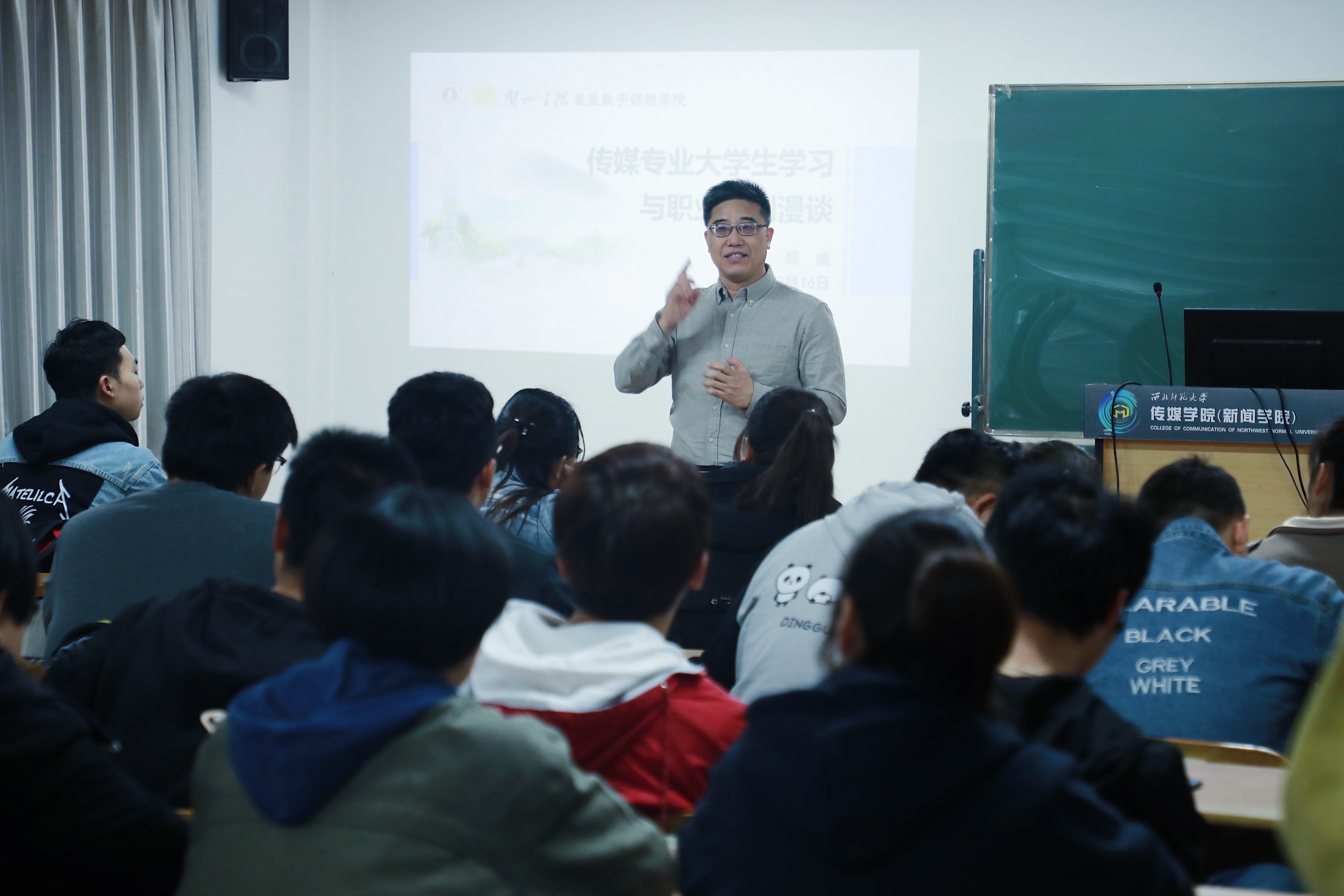 接下来,郑经理围绕三个问题:传媒专业要什么?传媒专业学什么?我们需要做什么?展开了讨论。郑经理还给同学们举例说明了实习期时应该如何进行规划,也鼓励员工创业,学会营销,培养市场意识,投身到实践中去。