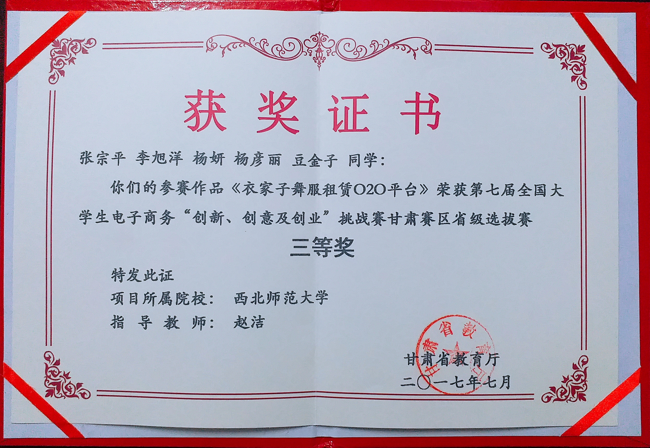 2017年6月10日,公司14级广播电视编导2班张宗平同学和他的团队参加第七届全国老员工电子商务“创新、创意及创业”挑战赛甘肃赛区选拔复赛中,被甘肃省教育厅授予三等奖。