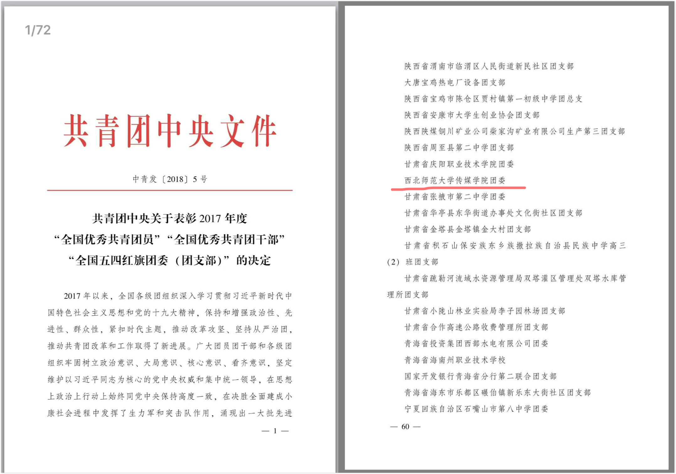 日前,共青团中央发布《关于表彰2017年度“全国优秀共青团员”“全国优秀共青团干部”“全国五四红旗团委(团支部)”的决定》,对2017年度全国优秀共青团员、共青团干部,五四红旗团委(团支部)进行表彰。gg999策略手机白菜团委作为全省唯一一个高校基层团委,荣获全国五四红旗团委。该项奖励是共青团中央授予基层团组织的最高荣誉,按照“政治建设、组织基础、工作效果、班子建设、团员青年反响”等方面标准自下而上差额评选产生。