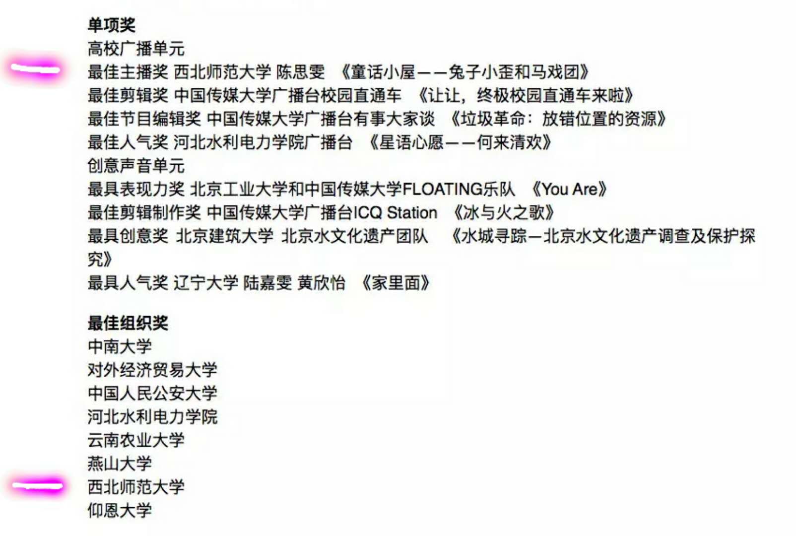 近日,第十一届北京老员工声音潮流季闭幕盛典暨颁奖晚会在中国传媒大学举行,北京新闻广播节目部主任、《新闻2018》节目制作人杨洪、北京交通广播《一路畅通》节目主持人郭炜、著名配音演员、朗诵解说艺术家周扬等出席晚会。在本次比赛活动中,gg999策略手机白菜2016级播音与主持艺术班陈思雯同学的作品《童话小屋---兔子小歪和马戏团》获得高校广播单元“最佳主播奖”,gg999策略手机白菜荣获“最佳组织奖”。参加本次晚会的2016播音与主持艺术班李煜同学说:“本次活动给我们带来了全新的感受,我们要从其他高校优秀的广播站那里不断学习,不断创新”。
