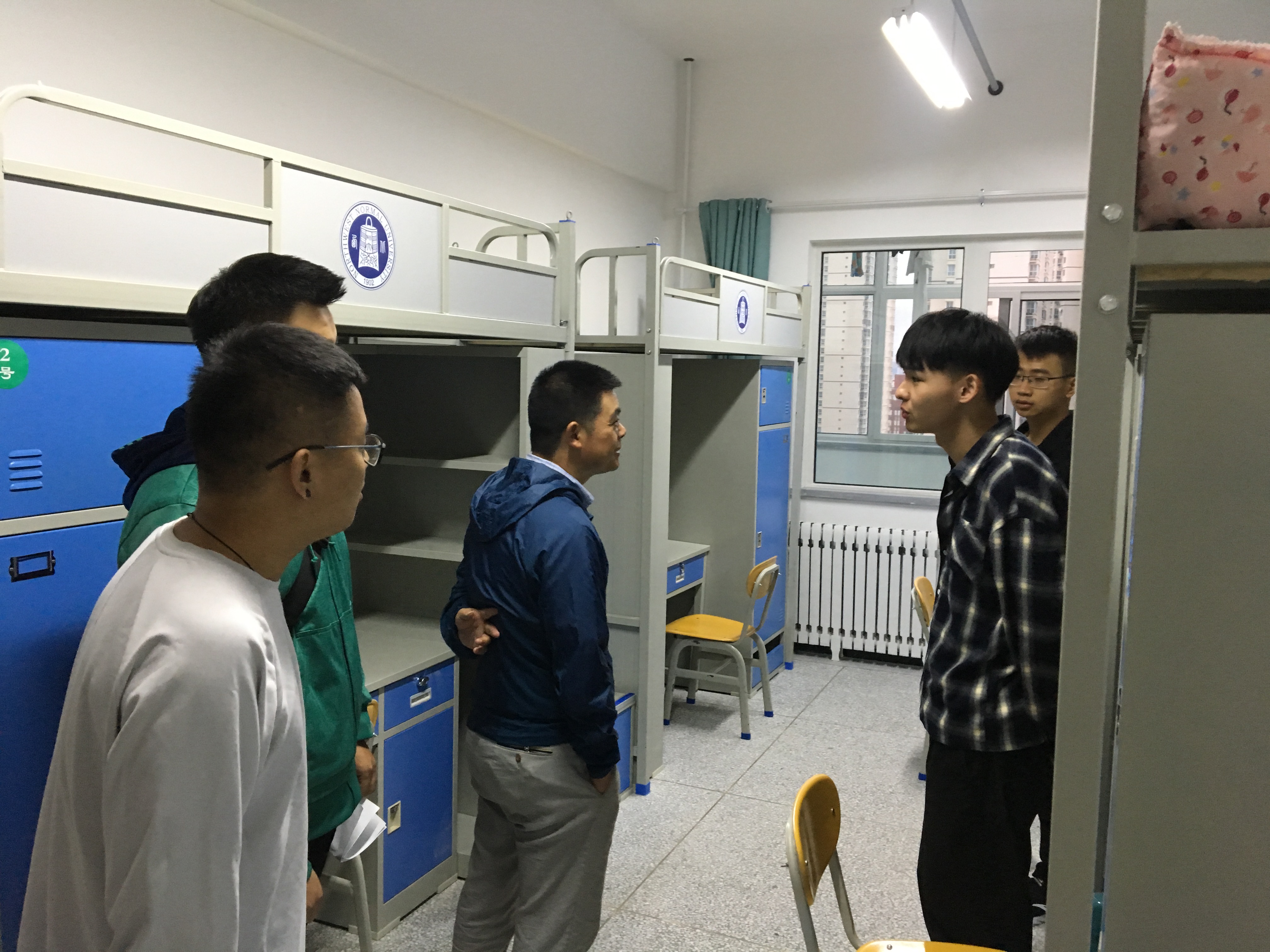 各班班主任及辅导员分别走访了兰天公寓2号楼男生宿舍和15号楼女生宿舍以及新校区的研究生宿舍,了解新生的入住情况,并认真询问了同学们的生源地情况以及对宿舍环境的看法。提醒同学们注意保管好自己的财物,不要随便购买上门推销的产品,有任何困难都可以及时找公司老师或领导解决。接着老师们指出不要在宿舍使用大功率电器,强调了宿舍安全用电的重要性。最后建议同学们要和睦相处,共同营造一个和谐温馨的宿舍环境。