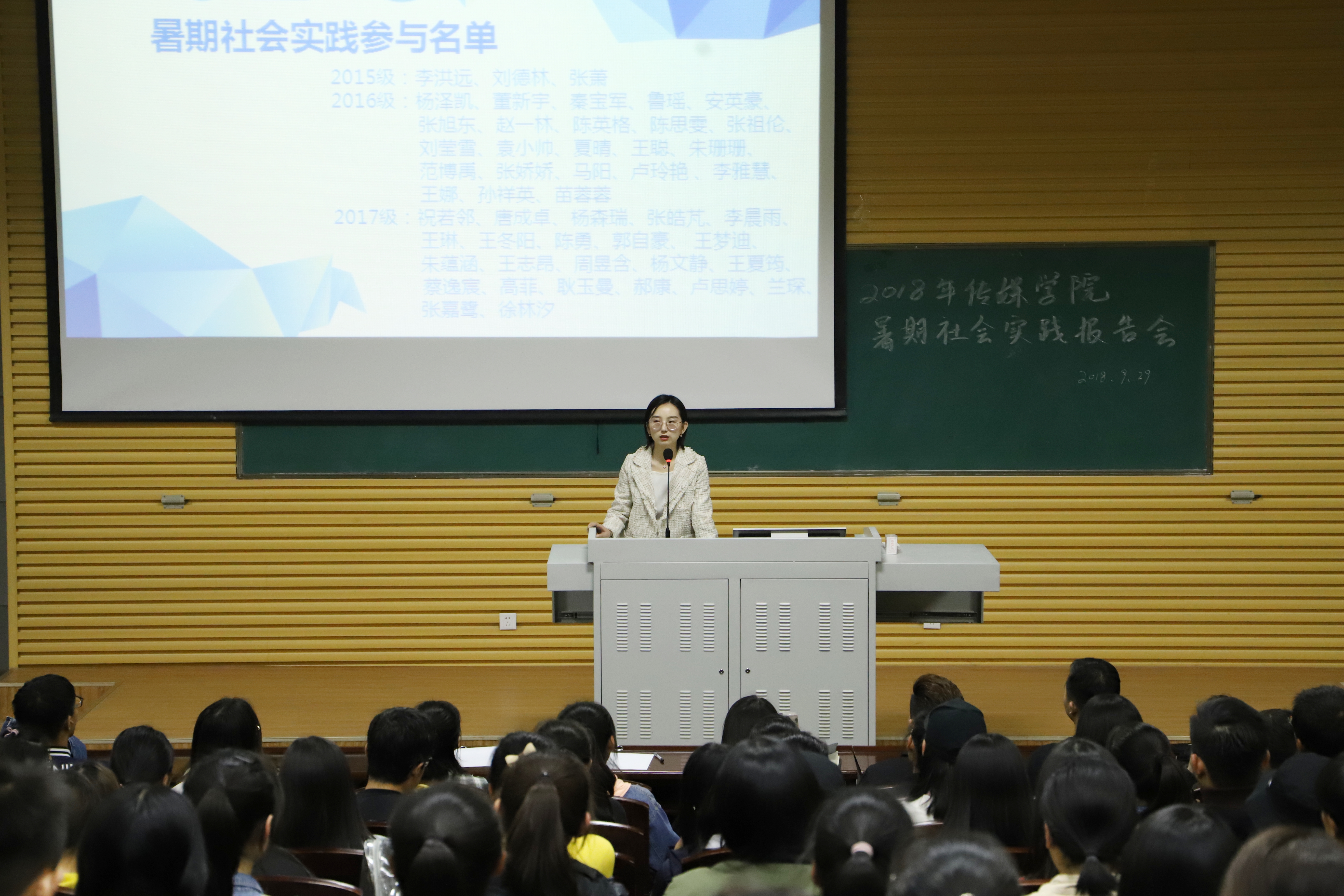 9月29日晚7点半,gg999策略手机白菜于新校区毅然报告厅一厅举行2018年暑期社会实践报告会。团委书记赵洁,公司辅导员查秀芳、袁会敏、高国靖,以及全体2018级本科生和员工会全体成员参会。