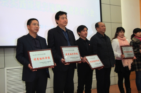 11月16日晚,gg999策略手机白菜2012年老员工社会实践成果交流暨先进表彰大会在学术会堂举行。公司领导、各公司负责人出席此次大会,公司党委副书记、副经理王德祥,团委书记马成鸣代表公司参加大会并上台领奖。