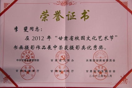 近日,甘肃省委宣传部、省文明办、团省委、省教育厅、省文化厅、省学联联合表彰了2012年甘肃省校园文化艺术节先进集体和获奖个人。公司2011级广播电视编导班曹璇在书画摄影展比赛中荣获二等奖,2010级编导班李思昱、2011级编导班李斐获得优秀奖。