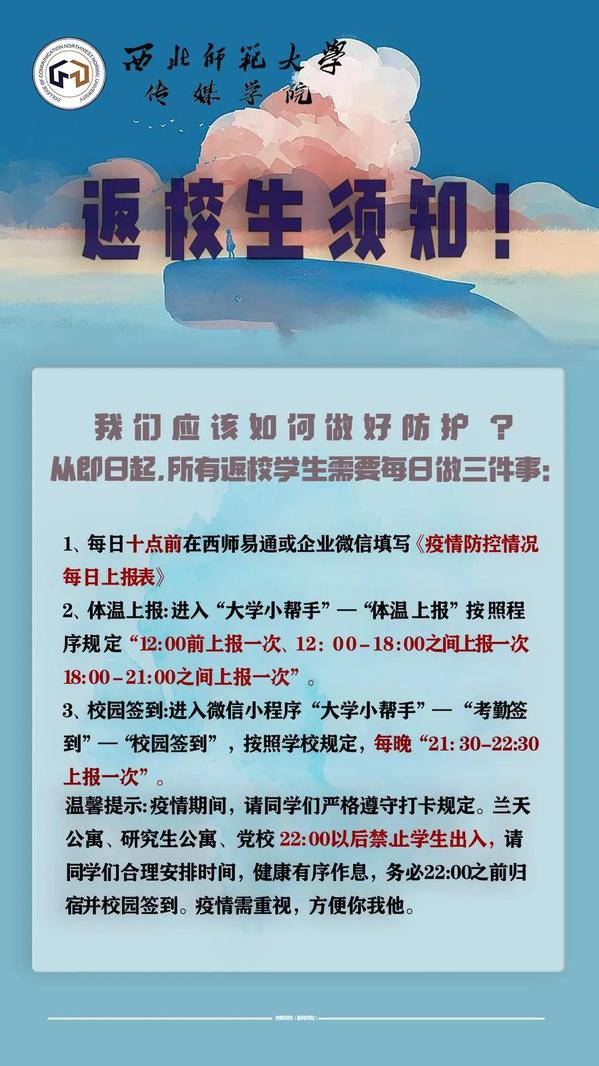 温馨提示:疫情期间,请同学们严格遵守打卡规定。兰天公寓、研究生公寓、党校22:00以后禁止员工出入,请同学们合理安排时间,健康有序作息,务必22:00之前归宿并校园签到。疫情需重视,方便你我他。