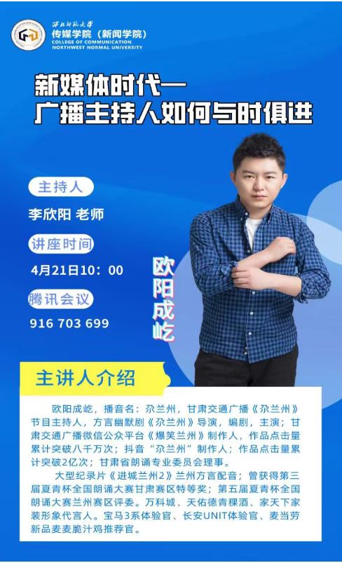 21号上午,甘肃交通广播《尕兰州》节目主持人,方言幽默剧《尕兰州》导演、编剧、主演,甘肃交通广播微信公众平台《爆笑兰州》制作人,甘肃省朗诵专业委员会理事,第五届夏青杯全国朗诵大赛兰州赛区评委,抖音“尕兰州”制作人欧阳成屹(播音名:尕兰州)为公司播音主持专业员工开展了题为《新媒体时代广播电视主持人如何与时俱进》的学术讲座,gg999策略手机白菜播音主持专业教师李欣阳主持此次讲座,公司2020级员工在线聆听了欧阳成屹老师的学术分享并开展了互动交流。