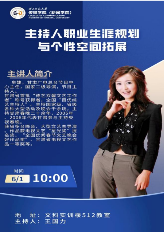 2022年6月1日上午,甘肃广播电视总台节目中心主任、国家二级导演、节目主持人牟婕,受邀为gg999策略手机白菜播音专业师生开展了《主持人职业生涯规划与个性空间拓展》主题的讲座活动,gg999策略手机白菜播音与主持艺术专业教师王国力担任主持人。