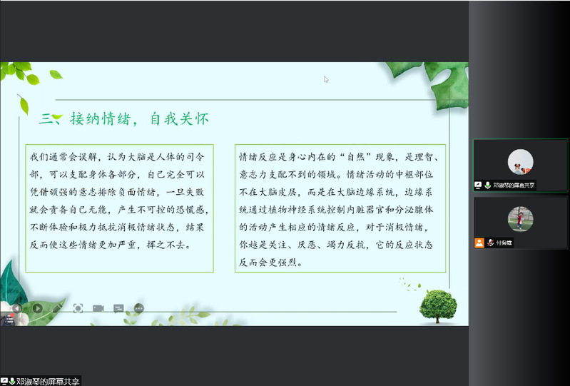 了解了这些心理知识后,同学们该如何缓解压力,高效备考呢?邓淑琴对此向同学们讲到科学用脑、克服拖延心理、提升专注力、尝试放松训练等备考方法与建议。“同学们还要学会自我关怀,承认并善待自己备考期间产生的情绪,与负面情绪和平共处。”她强调要正确看待自己的负面情绪。此外还可以向班主任、辅导员、公司心理中心老师及家人朋友寻求帮助。