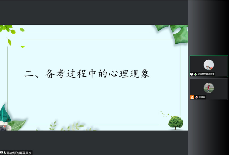 在备考过程中,通常会产生一些心理现象,如舌尖现象、高原现象、克拉克现象、习得性无助或心理饱和现象等。邓淑琴详细介绍了这些现象的具体症状,并提出了夯实基础、抱有信心、找准弱点、设定合理期望值、勇于尝试等针对性建议。