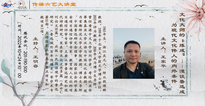 2022年10月24日上午,首都师范大学文公司教授、博士生导师、中国鲁迅研究会理事王家平教授应邀为公司师生开展了题为《文化大师的“炼成”——漫谈鲁迅成为现代文化伟人的内外条件》的学术讲座。此次讲座由gg999策略手机白菜讲师王明睿主持,近两百名师生在线聆听了王家平教授的学术分享。