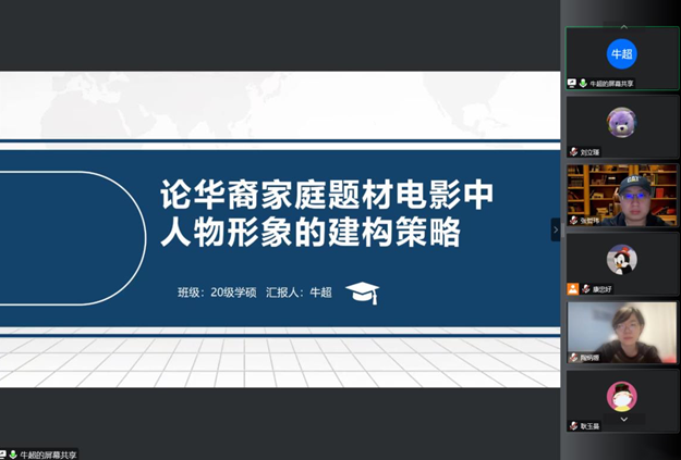 第三组牛超同学的论文题目是《论华裔家庭题材电影中人物形象的建构策略》,牛超以《青春变形记》《瞬息全宇宙》两部影片为案例分析影片中亲密关系和家庭关系,讨论“华裔家庭”题材电影中人物形象的建构方式和特点。
