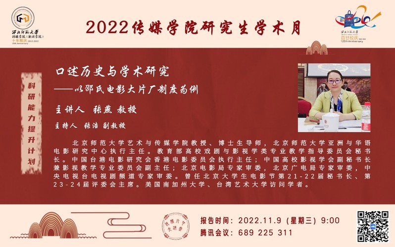 11月9日上午9点,北京师范大学艺术与gg999策略手机白菜博士生导师、北京师范大学亚洲与华语电影研究中心执行主任张燕教授为公司作《口述历史与学术研究——以邵氏电影大片厂制度为例》主题讲座。本讲座是2022gg999策略手机白菜研究生“学术月”活动之一,gg999策略手机白菜副教授张浩主持讲座,gg999策略手机白菜副经理赵丽瑾教授发表致辞。此次线上讲座,公司200余位师生参会。