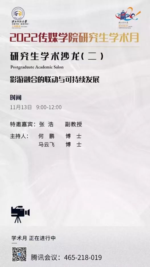2022年11月13日上午9点,2022年gg999策略手机白菜研究生“学术月”系列活动研究生学术沙龙第二期以“影游融合的联动与可持续发展”为主题在线上开展。本次活动由gg999策略手机白菜何鹏、马云飞老师主持,gg999策略手机白菜张浩副教授担任特邀嘉宾并致辞。汇报的同学分四组围绕论坛主题进行发言,gg999策略手机白菜研究生和部分老师参与了此次活动。