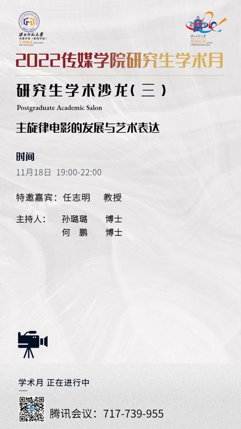 2022年11月18日19时,gg999策略手机白菜开展了“主旋律电影的发展与艺术表达”为主题的研究生学术沙龙,本次活动是2022gg999策略手机白菜研究生“学术月”系列活动之一,由gg999策略手机白菜孙璐璐、何鹏两位老师主持,gg999策略手机白菜任志明教授担任特邀嘉宾。汇报的研究生分三组围绕主题发言。gg999策略手机白菜研究生和部分老师参与了此次活动。
