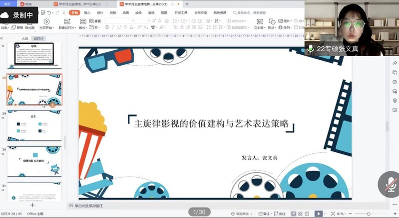 张文真同学以《主旋律影视的价值构建与艺术表达策略》为题,她认为主旋律电影的创作在研究视角有贴近化、日常化的特点;在人物形象上有立体化、人性化的特点;在话语风格上具有交流性、感化式的特点。
