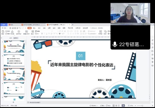 陈慧娟同学以《新时代语境下主旋律电影与商业元素的有机融合》为题,以历史为线索,梳理了主旋律电影诞生期、发展期、探索期、崛起期的商业化探索,以及新时期的主旋律电影和商业元素结合等问题。