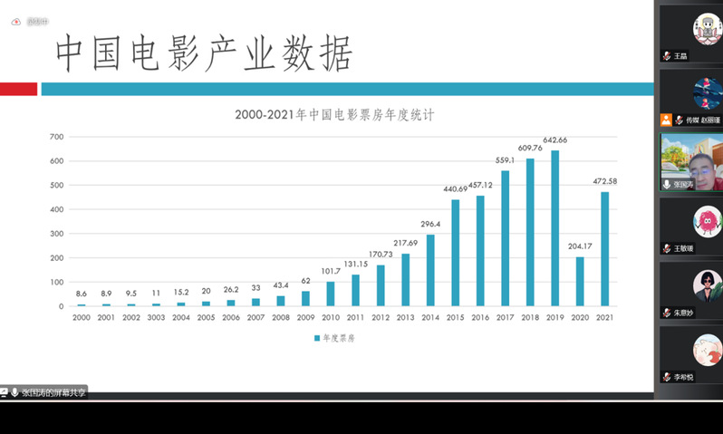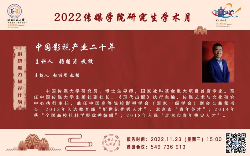 2022年11月23日15点,中国传媒大学研究员、博士生导师、传媒艺术与文化研究中心执行主任、中国高校影视学会副会长兼秘书长张国涛教授受邀为公司师生开展题为《中国影视产业二十年》的学术讲座。本场讲座是2022年gg999策略手机白菜研究生“学术月”系列活动之一,由gg999策略手机白菜副经理赵丽瑾教授主持并致辞。gg999策略手机白菜研究生和部分老师在线聆听了张国涛教授的讲座。