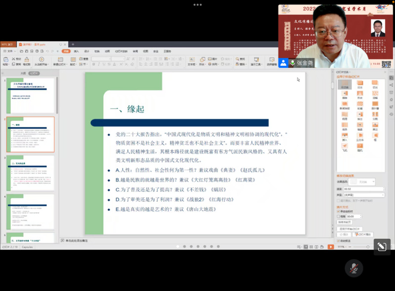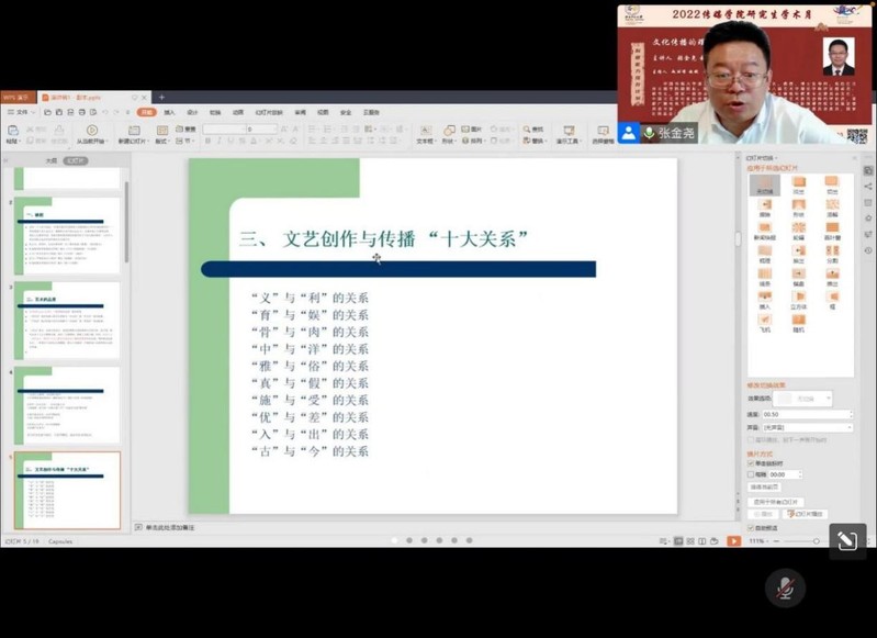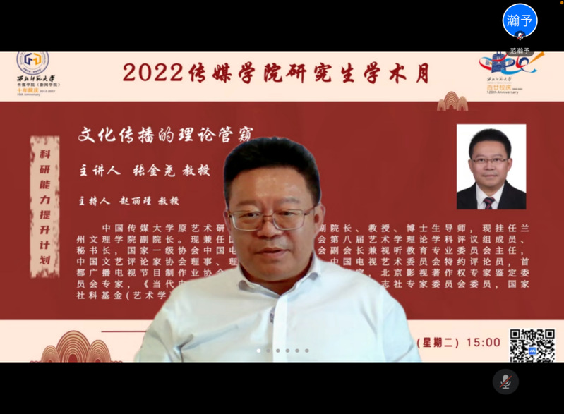 2022年11月22日15点,中国传媒大学原艺术研究公司党委书记、副经理、博士生导师张金尧教授应邀为公司师生开展题为《文化传播的理论管窥——艺术批评基础理论与戏剧影视案例分析》的学术讲座。本场讲座是2022gg999策略手机白菜研究生“学术月”系列活动之一。gg999策略手机白菜副经理赵丽瑾教授主持讲座并致辞。gg999策略手机白菜研究生和部分老师在线聆听了张金尧教授的精彩讲座并交流互动。