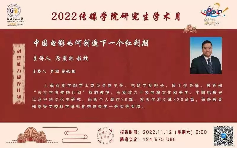 2022年11月12日上午9点,上海戏剧公司学术委员会副主任、电影公司经理、博士生导师、教育部“长江学者奖励计划”特聘教授厉震林应邀为公司师生开展题为《中国电影如何创造下一个红利期》的学术讲座。本次讲座是2022gg999策略手机白菜研究生“学术月”系列活动“科研能力提升计划”第三讲,gg999策略手机白菜副经理赵丽瑾教授发表致辞,gg999策略手机白菜副教授芦珊主持本次讲座,此次线上讲座公司100余位师生参会,在线聆听了厉震林教授的学术分享。