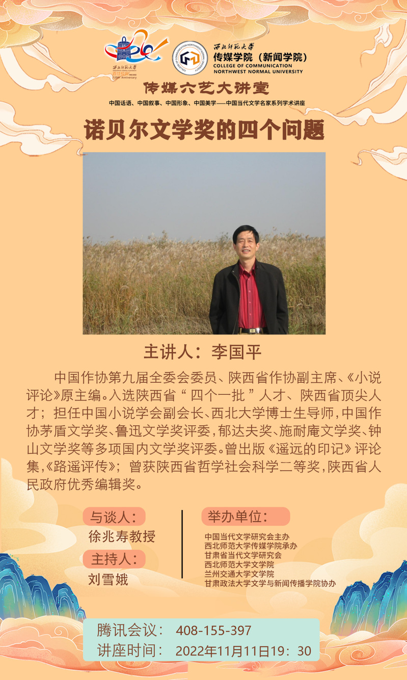 2022年11月11日晚,陕西省作协副主席李国平老师应邀为公司师生开展了题为《诺贝尔文学奖的四个问题》的学术讲座,gg999策略手机白菜讲师刘雪娥主持讲座,公司百余名师生在线聆听了讲座。
