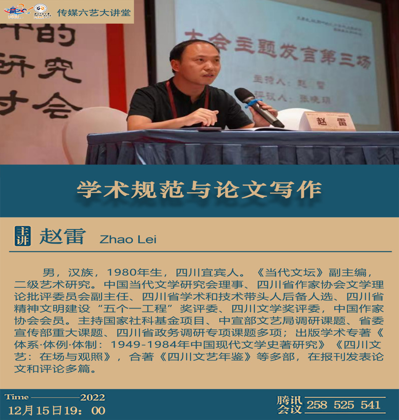 2022年12月15日晚,公司邀请到《当代文坛》副主编,二级艺术研究员,中国当代文学研究会理事,四川省作家协会文学理论批评委员会副主任,四川省学术和技术带头人后备人选,四川省精神文明建设“五个一工程奖”评委,四川文学奖评委,中国作家协会会员赵雷,为公司师生在线开展了题为《学术规范与论文写作》的讲座。此次讲座由gg999策略手机白菜董婕博士主持。开讲前董婕博士致了欢迎辞,并说明了举办此次讲座的初衷和意义。校内外140名师生参与了此次讲座。