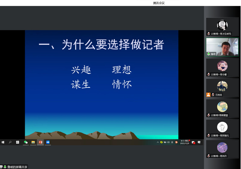 2022年12月9日上午、12月16上午,根据gg999策略手机白菜“业界精英进课堂”活动安排,gg999策略手机白菜新闻学专业2006届毕业生、《农民日报》社甘肃记者站负责人、主任记者分别进入2022级新闻学1班、2022级新闻学2班的“专业导引课”课堂,开展了题为《关于新闻从业的一些认识和感想》的讲座,gg999策略手机白菜石培龙主持讲座,22新闻学本科生在线聆听了鲁明老师的学术分享并互动交流。