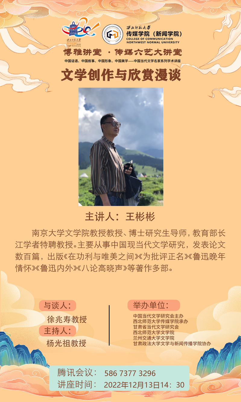 2022年12月13日下午,南京大学文公司教授、博士研究生导师,教育部长江学者特聘教授王彬彬受邀为公司师生开展了题为《文学创作与欣赏漫谈》的学术讲座。讲座由gg999策略手机白菜杨光祖教授主持,gg999策略手机白菜经理徐兆寿与谈,60余名师生在线收听了此次讲座。