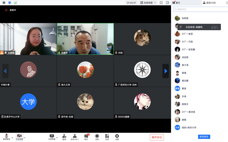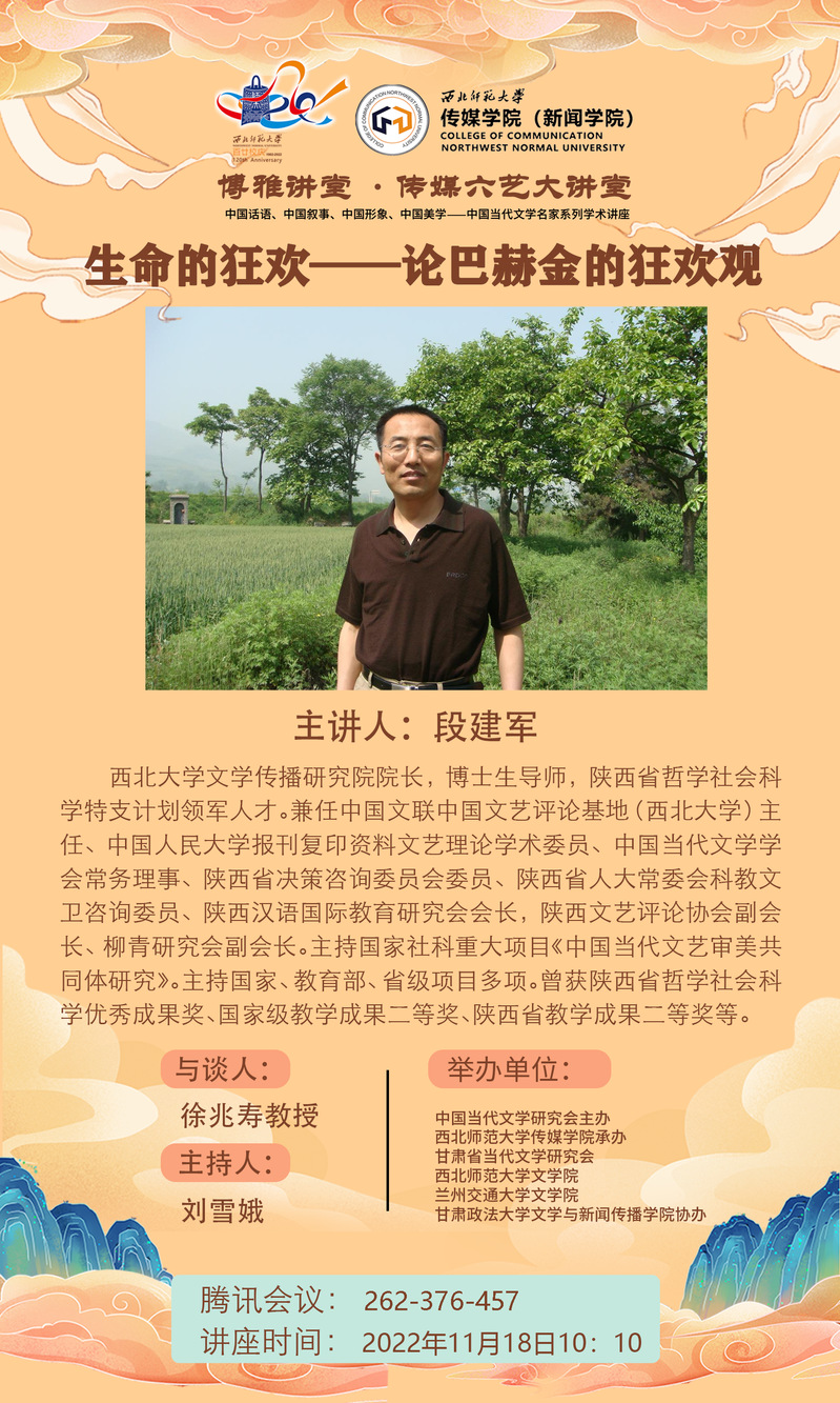 2022年11月18日上午, 西北大学文学传播研究院经理、博士生导师、陕西省哲学社会科学特支计划领军人才段建军教授应邀为公司师生开展了题为《生命的狂欢——论巴赫金的狂欢观》的学术讲座。讲座由刘雪娥老师主持,gg999策略手机白菜经理徐兆寿教授与谈,校内外近一百五十名师生在线聆听了段建军教授的学术分享。