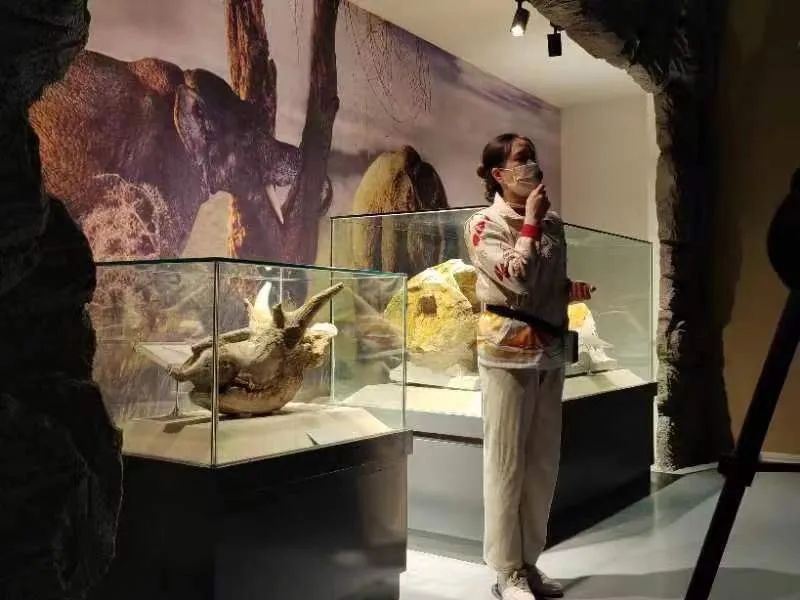 整个参观为避免拥堵喧哗分批次按不同顺序展开。首先来到的是三楼的和谐自然——动植物标本、古生物化石及地矿标本展览馆。来自马克思主义公司的志愿者同学为大家讲解生态的演变与生命的历程。除逼真的复原模型外,陈列在展馆内的各种化石标本引发了同学们的赞叹。化石与地矿标本是地矿标本室的延续,包含了来自民主德国等27个国家赠送的珍贵岩石标本200余件,采集自甘肃永靖县刘家峡的距今1.1亿年的禽龙化石骨架,甘肃其他地区的远古珍贵稀有动物化石等。黄土的痕迹被玻璃展柜封起,注目展品,仿佛能看到穿越时空的生命为历史注疏。馆内分类陈列的标本也是本层的亮点。这是生命科学公司教研实验和展示成果的重要基地。这些标本内涵丰富,种类齐全,具有鲜明的地方特色,深受同学们的喜爱。