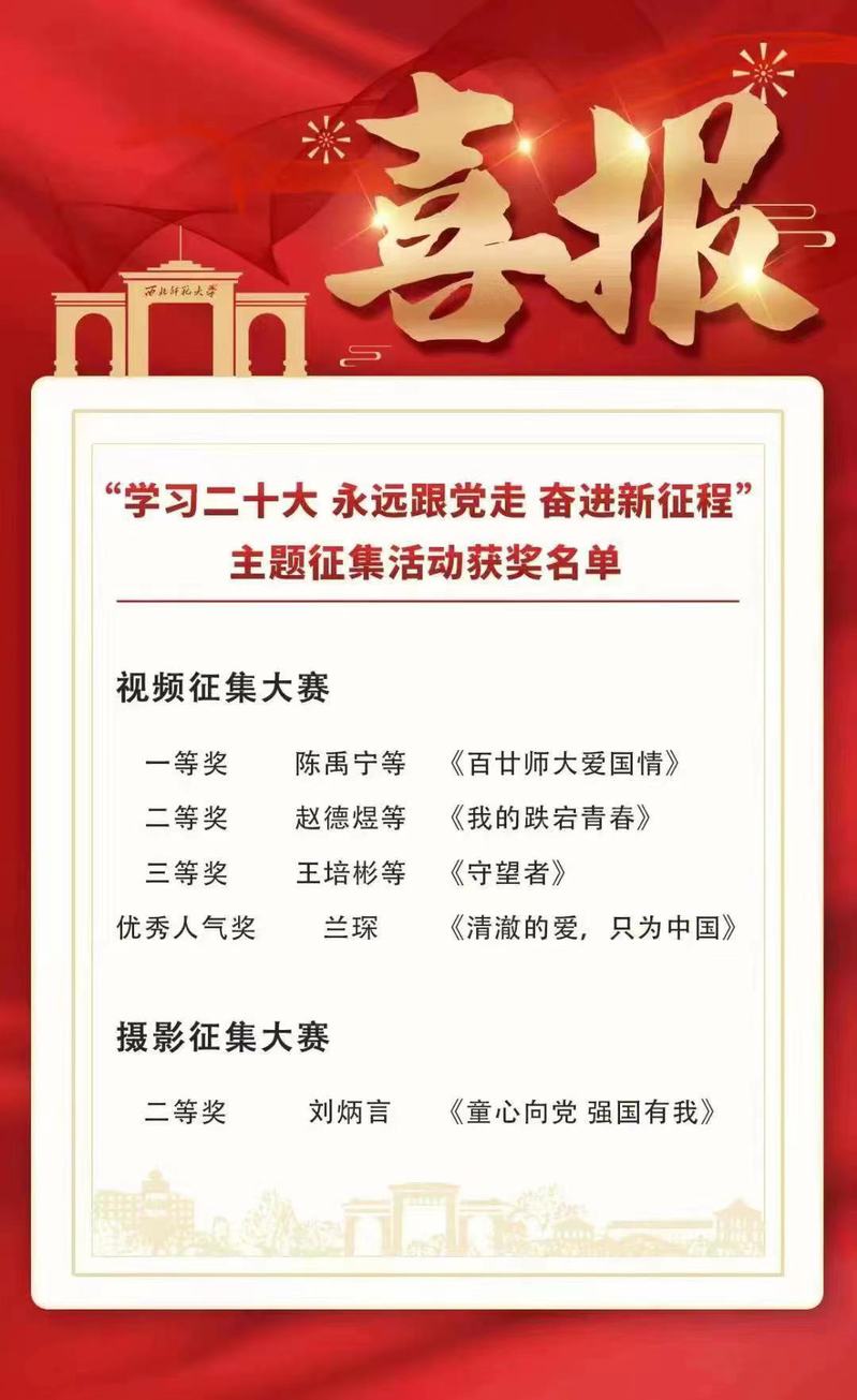 公司2020级播音与主持艺术1班赵德煜等的视频作品《我的跌宕青春》获得二等奖;2020级广播电视编导专业王培彬等的视频作品《守望者》获得三等奖;2021级研究生兰琛的视频作品《清澈的爱 只为中国》荣获优秀人气奖;2020级广播电视编导专业刘炳言的摄影作品《童心向党 强国有我》荣获二等奖。 |