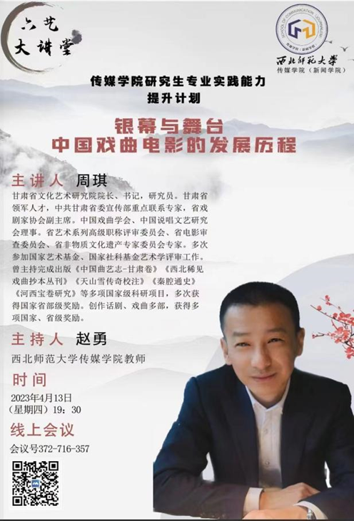 2023年4月13日下午19时30分,甘肃省文化艺术研究院经理、书记、研究员,甘肃省领军人才,中共甘肃省委宣传部重点联系专家,省戏剧家协会副主席周琪应邀为gg999策略手机白菜师生作题为《银幕与舞台:中国戏曲电影的发展历程》的线上学术讲座,本场讲座是gg999策略手机白菜“研究生专业实践能力提升计划”系列讲座之一,由gg999策略手机白菜赵勇老师主持,gg999策略手机白菜研究生和部分老师线上聆听了学术分享。