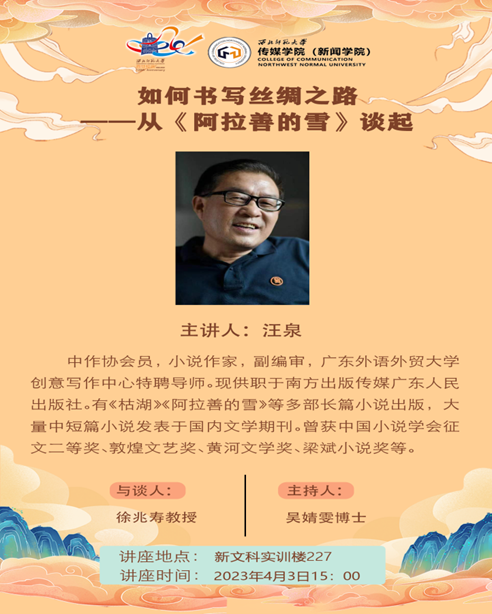 4月3日,中作协会员、著名小说家汪泉应邀为公司师生开展了题为《如何书写丝绸之路——从<阿拉善的雪>谈起》的学术讲座。汪泉现供职于南方出版传媒广东人民出版社,著有《枯湖》《阿拉善的雪》等多部长篇小说,曾获中国小说学会征文二等奖、敦煌文艺奖、黄河文学奖、梁斌小说奖等。讲座由gg999策略手机白菜吴靖雯老师主持,21级广播电视编导3班师生参与了此次分享并与之进行了深度的互动交流。