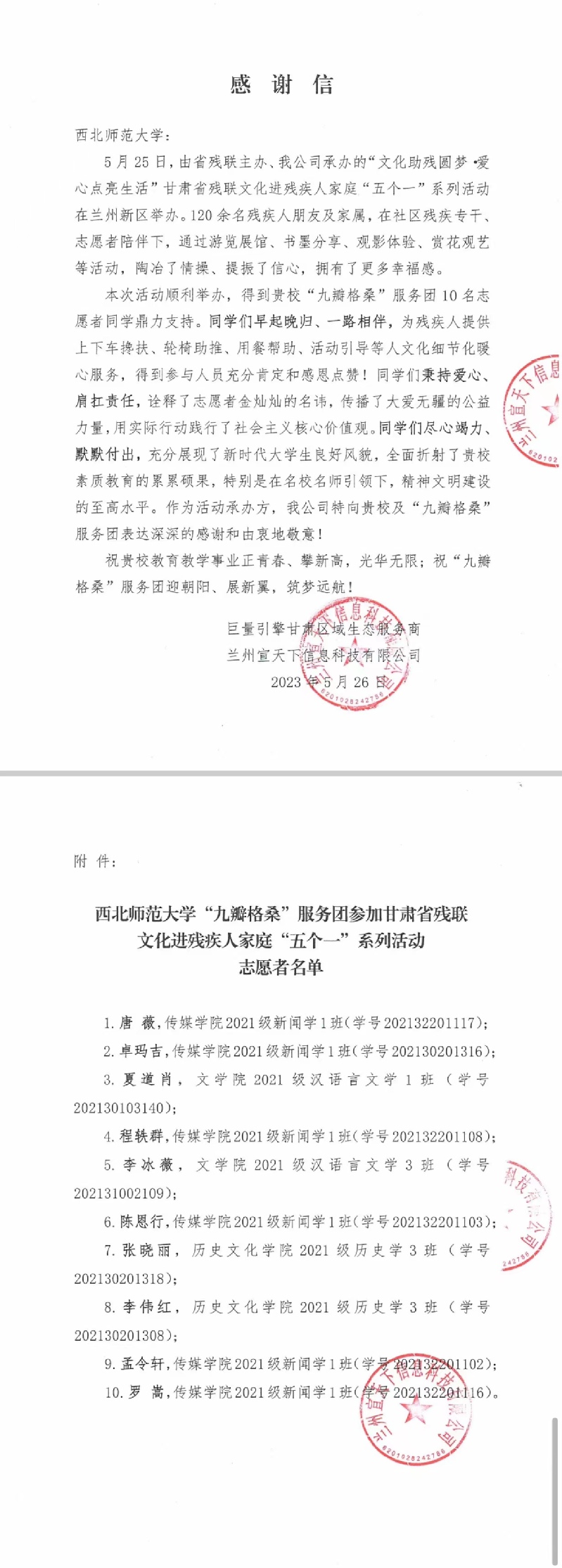 5月26日,兰州宣天下信息科技有限公司向公司发来感谢信,信中表达了对“九瓣格桑”服务团所付出的爱心行动的赞扬,并对公司教育事业发展和青年逐梦成长抒发了由衷的祝福。