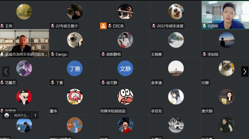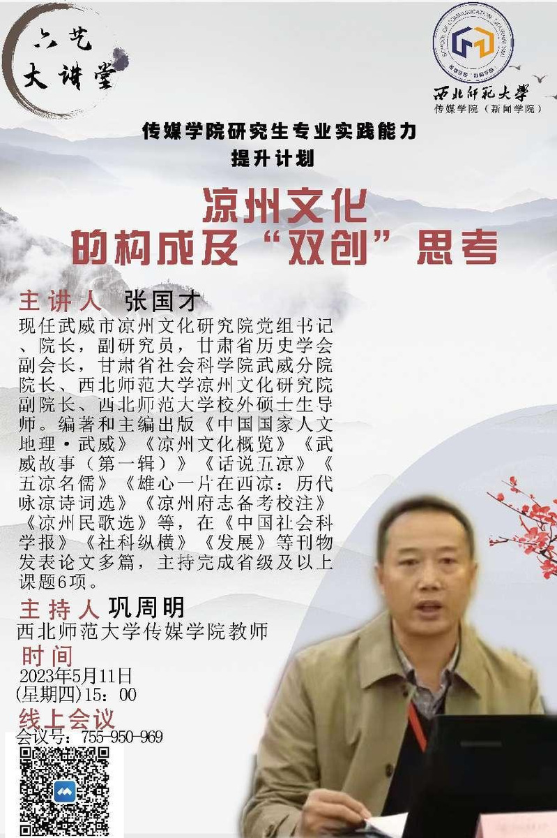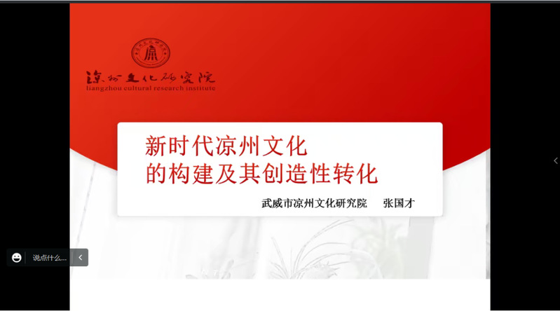 2023年5月11日下午3时,武威市凉州文化研究公司党组书记经理、副研究员、甘肃省历史学会副会长、甘肃省社会科公司武威分院经理、gg999策略手机白菜凉州文化研究院副经理、gg999策略手机白菜校外研究生导师张国才为公司师生做了题为《凉州文化的构成及“双创”思考》的线上学术讲座,由gg999策略手机白菜巩周明老师主持,gg999策略手机白菜研究生和部分老师聆听了线上讲座。