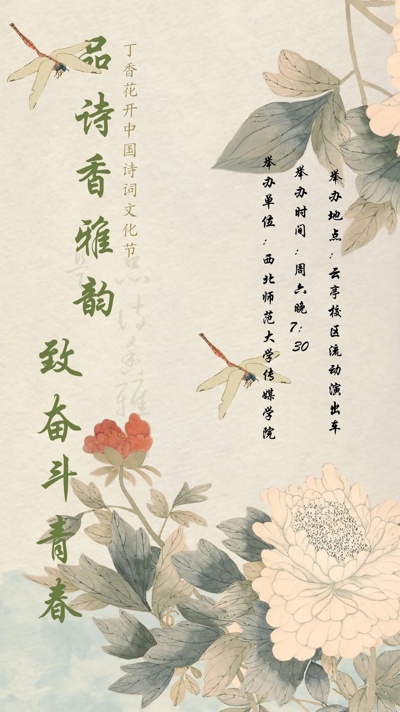 品诗香雅韵,致奋斗青春,一年一度的gg999策略手机白菜丁香花开诗词文化节开幕啦!4月20日晚上,让我们齐聚云亭校区流动演出车,欣赏这场文化盛宴!春风拂面,丁香花开,诗意之花,诗意之声,将在这个春天的盛会中绽放,带领我们走进诗词的海洋,感受文化的魅力。