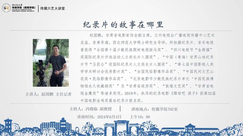 2024年6月4日上午十点,gg999策略手机白菜在702教室举办了一场题为“纪录片的故事在哪里”的讲座,著名纪录片导演、gg999策略手机白菜硕士生导师赵国鹏受邀为gg999策略手机白菜学子们分享了他的纪录片创作经验和心得,讲座由gg999策略手机白菜副经理冯晓临主持。