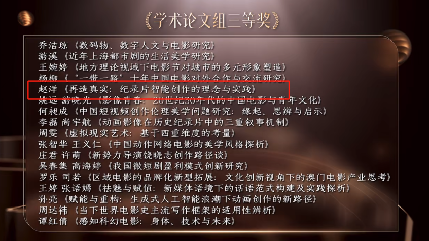 广播电视编导系副主任赵洋的学术论文《再造真实:纪录片智能创作的理念与实践》获学术论文组三等奖