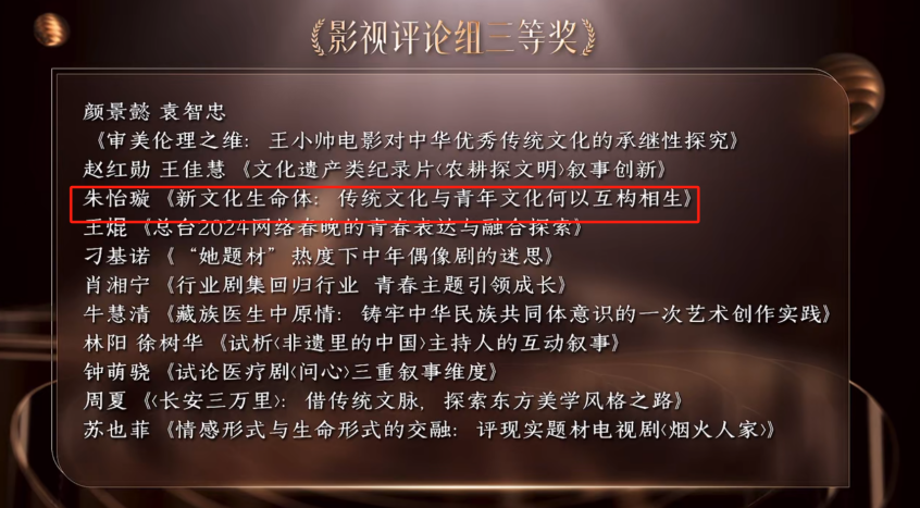 gg999策略手机白菜云亭教授朱怡璇的影视评论作品《新文化生命体:传统文化与青年文化何以互构相生》获影视评论组三等奖