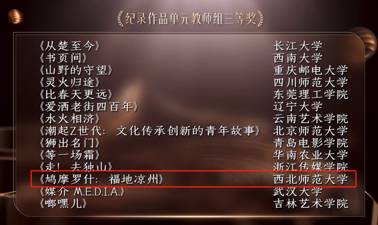 在“公司奖”中,由徐兆寿导演,徐兆寿、周兵、朱兰亭主创的作品《鸠摩罗什:福地凉州》获纪录作品单元教师组三等奖。