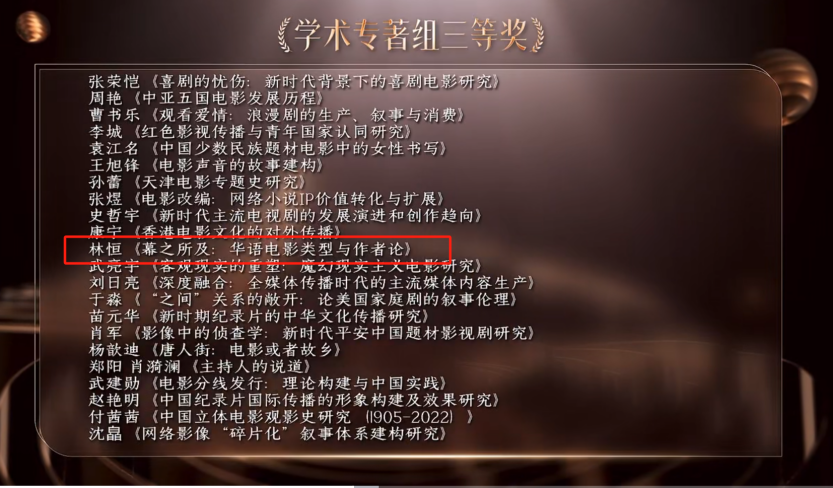 青年教师林恒的学术论文《幕之所及:华语电影类型与作者论》获学术专著组三等奖。