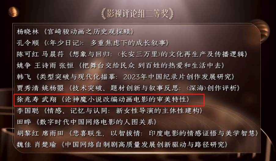 在“学会奖”中,gg999策略手机白菜中外写作中心徐兆寿主任、武翔的影视评论作品《论神魔小说改编动画电影的审美特性》获影视评论组二等奖。