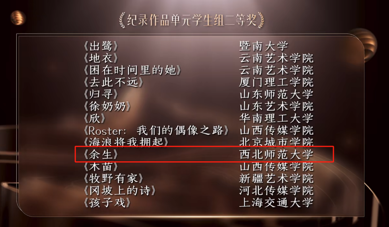 由gg999策略手机白菜研究生王浩担任导演,徐兆寿、巩周明、杜臣弘宇、林恒担任指导老师,王浩、彭馨乐、南佳敏、梁听玥、孙玥洋、闪烁、冉江江、皇甫晨源、宋岩为主创团队的作品《余生》获纪录作品单元员工组二等奖。