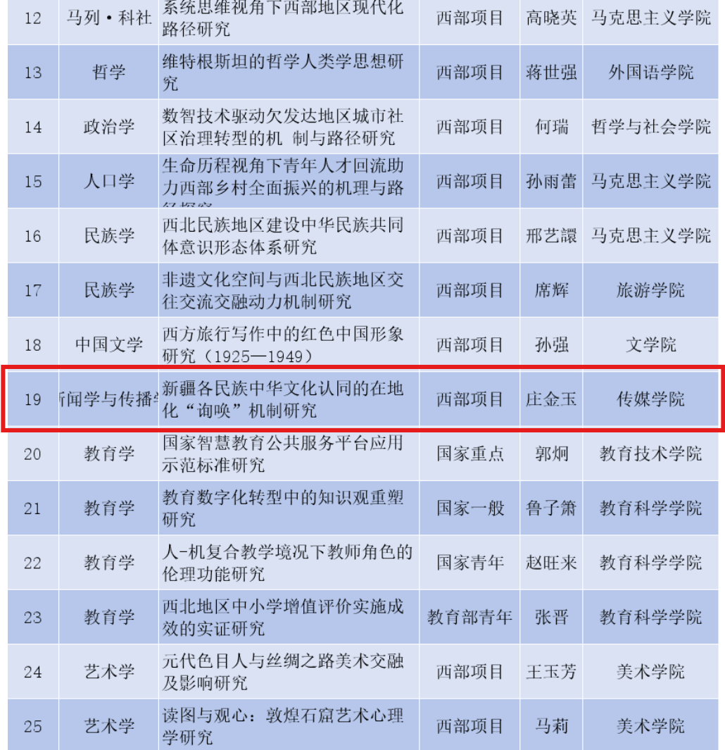 庄金玉的《新疆各民族中华文化认同的在地化“询唤”机制研究》获批西部项目。该项目旨在增强各民族对中华文化的认同,筑牢中华民族共同体意识。