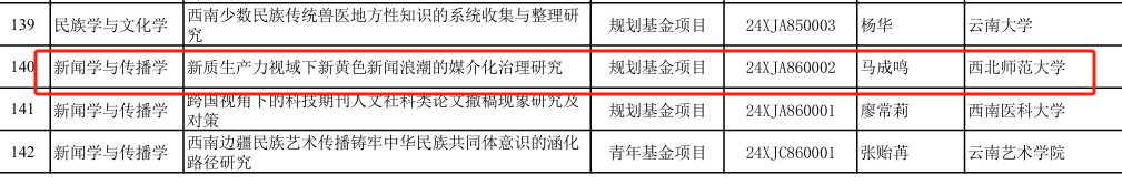马成鸣的《新质生产力视域下新黄色新闻浪潮的媒界化治理》,获批国家规划基金项目。